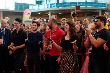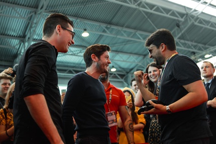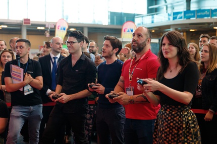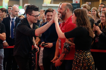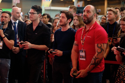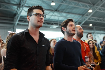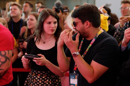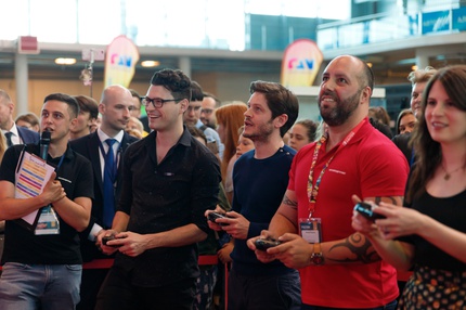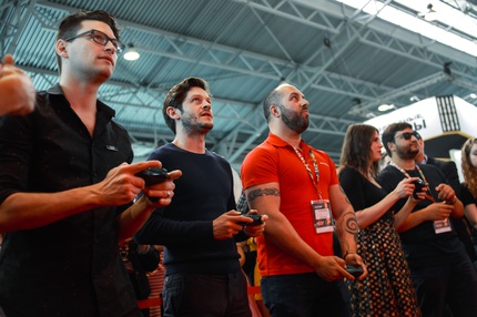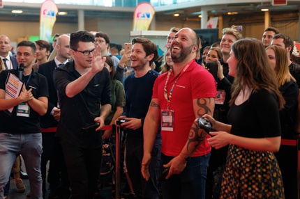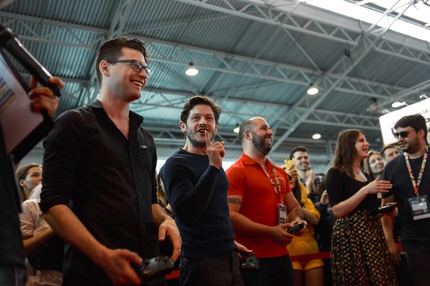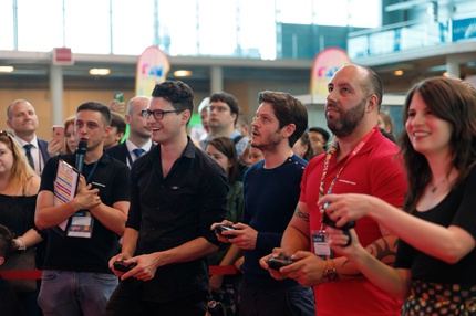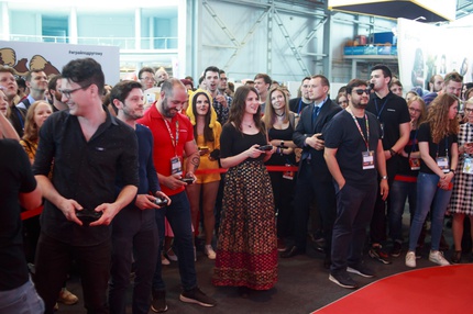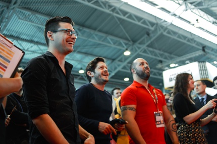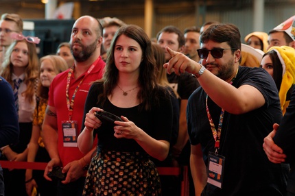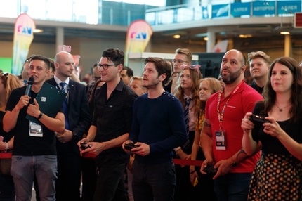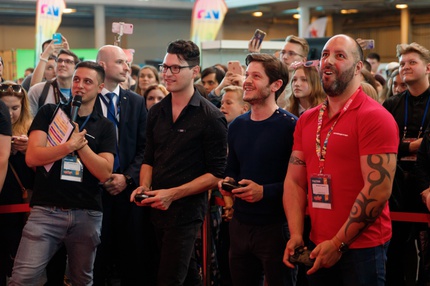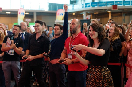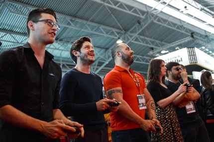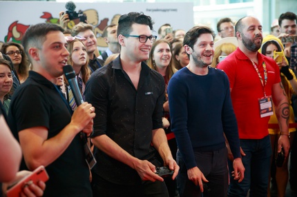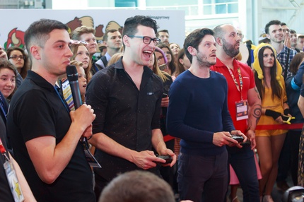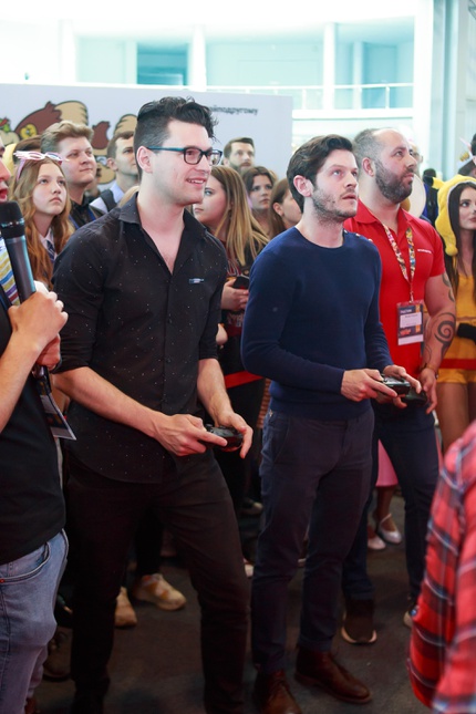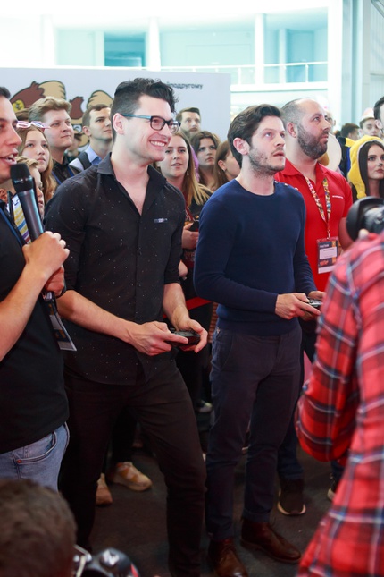 Иван Реон, Брайн Декарт и Амелия Роуз Блэр играют на стенде Nintendo